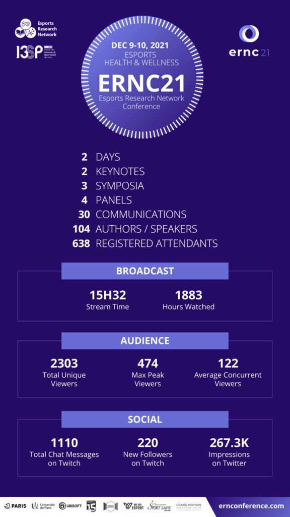 The first Esports Research Network Conference (ERNC 2021) was hosted by the Esports Research Network in collaboration with the Institut des Sciences du Sport-Santé (I3SP) at the University of Paris. The conference took place online on 9–10 December 2021 due to the COVID-19 pandemic and brought together an international and multidisciplinary community of researchers, students, and industry professionals. Across two days, ERNC 2021 featured 104 authors and speakers, 638 registered attendees, and reached more than 2,300 unique viewers worldwide.
